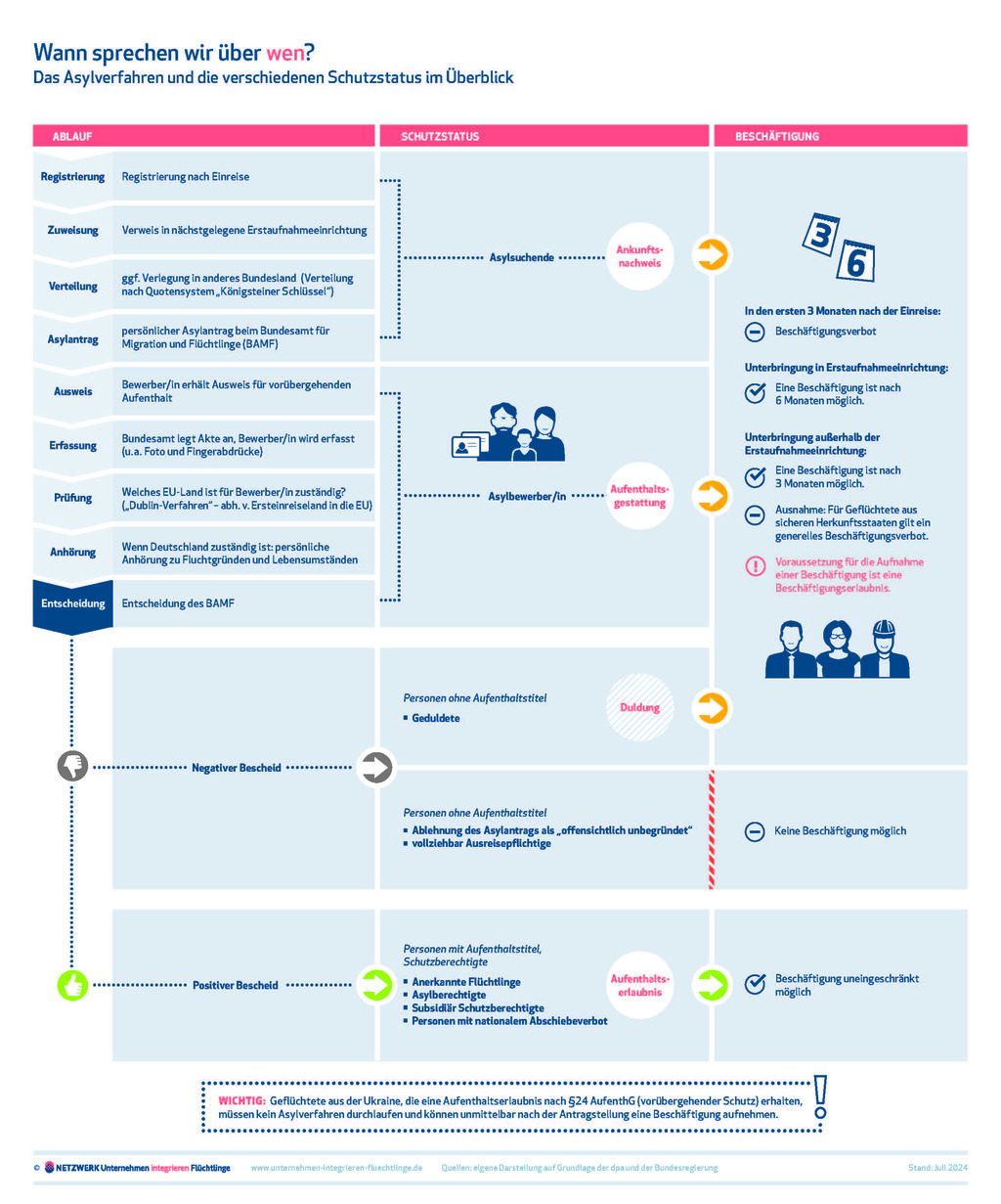 Eine Person gilt als Asylbewerber*in, sobald ein Asylantrag gestellt wurde, über den noch nicht entschieden ist. Während des Verfahrens wird eine Aufenthaltsgestattung erteilt. Für Herkunftsländer mit einer Schutzquote von 50 % oder mehr (aktuell Afghanistan, Eritrea, Somalia und Syrien) besteht eine „gute Bleibeperspektive“. Diese Einstufung wird jährlich überprüft.